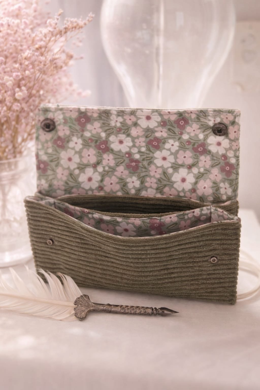 Portefeuille de voyage en velours côtelé kaki et coton fleuri