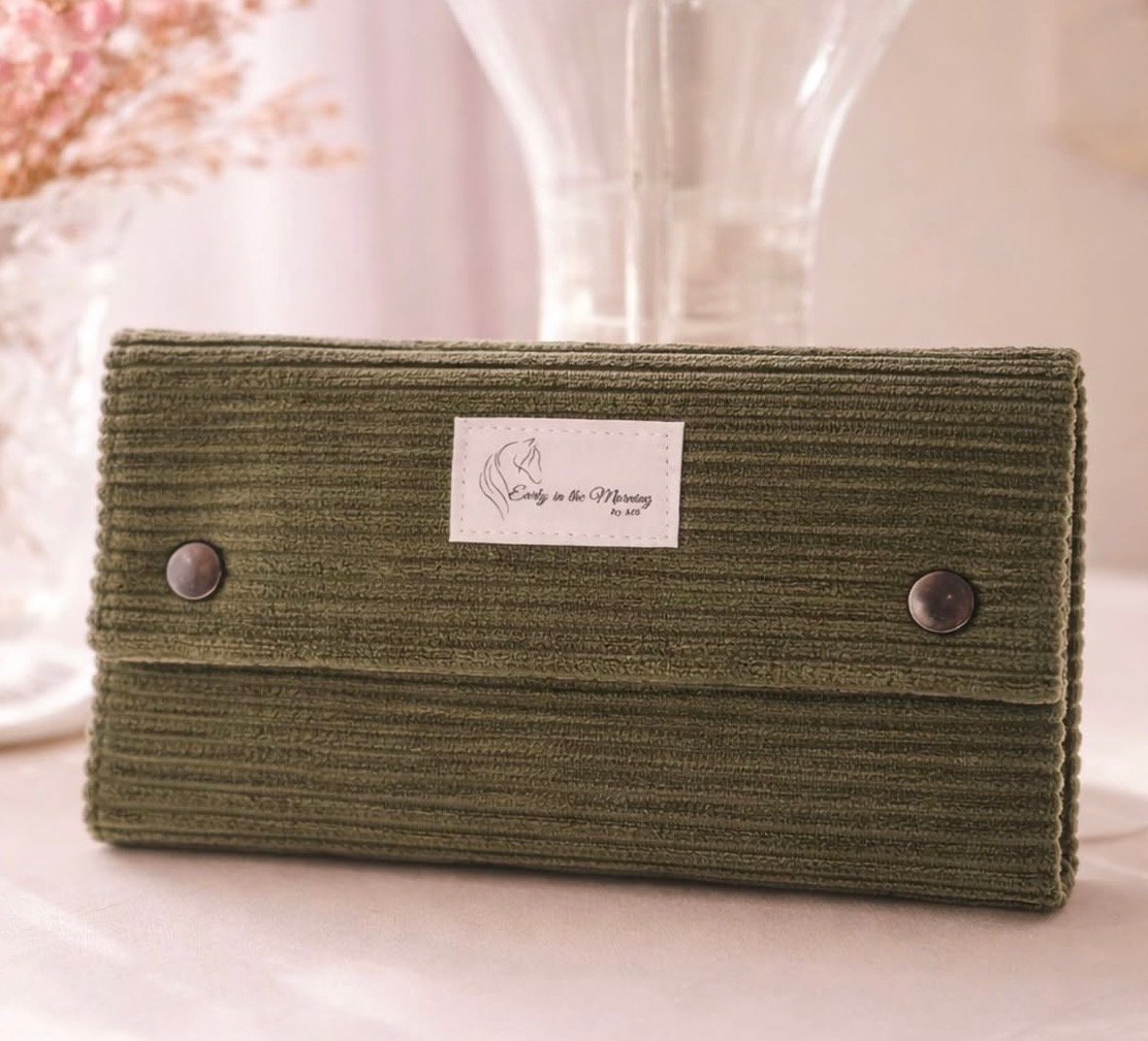 Portefeuille de voyage confectionné à la main en velours côtelé kaki aux reflets doux et tendres. Son rabat en coton fleuri tons rosés se referme grâce à deux pressions bronzes, un détail soigné qui révèle tout le soin apporté à chaque création. À l’intérieur, une doublure en coton fleuri coordonné accueille votre passeport, vos cartes et vos billets avec style et praticité.